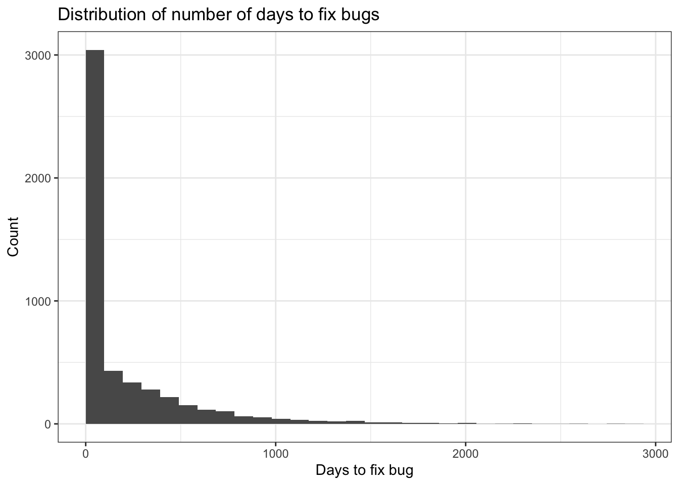 The plot below shows the distribution of time to fix bugs, giving a sense of how much variability there is.