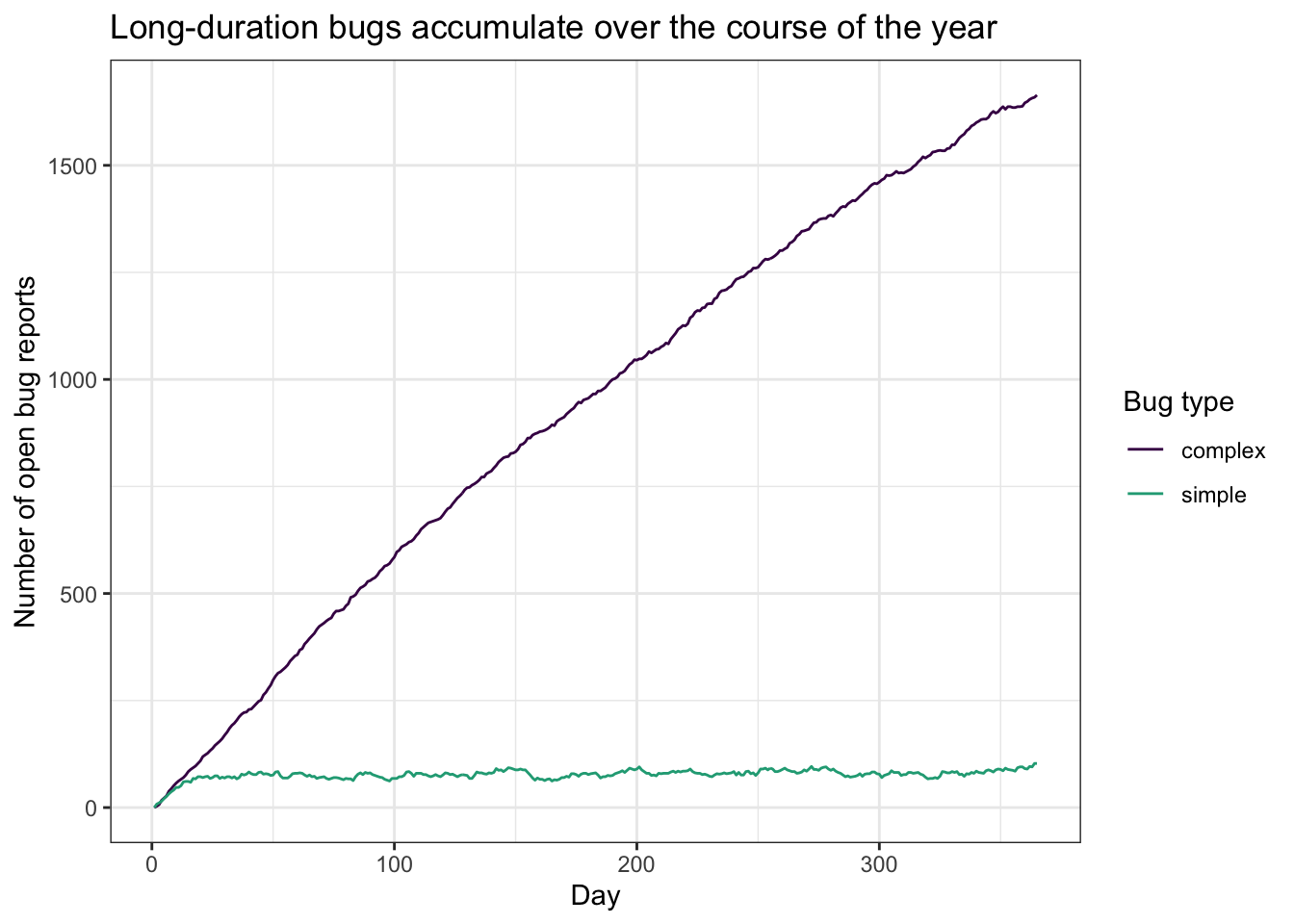 In my simulation, a bug takes a median of 32 days to resolve. But there are really two kinds of bugs: simple ones that are fixed quickly (median 8 days) and complex ones that take much longer (median 272 days). For simplicity, assume you receive equal numbers of simple and complex bugs.